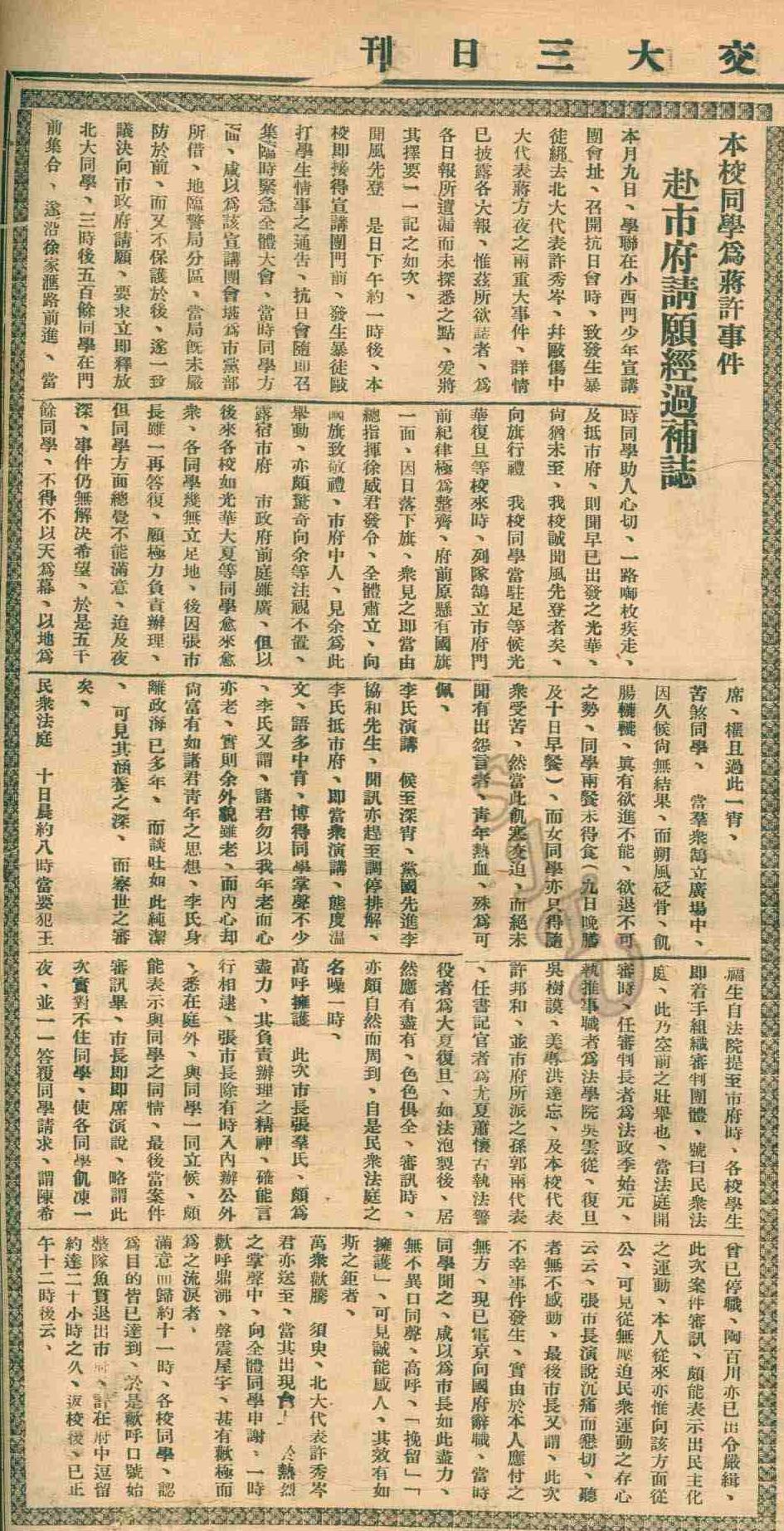 图1 1931年12月15日,《交大三日刊》详载围攻市政府事件经过