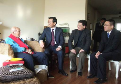 图4:2009年,交大校领导同志去看望张光斗院士。张杰(左二)、苏明(左三)、徐飞(左四)
