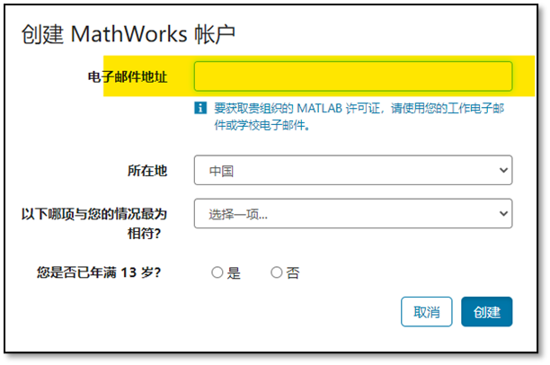 访问账户注册页面:https://ww2.mathworks.cn/mwaccount/account/create,然后填写账户信息,请务必使用学校的邮箱(后缀包含sjtu.edu.cn)作为电子邮箱地址(其他邮箱不识别)。