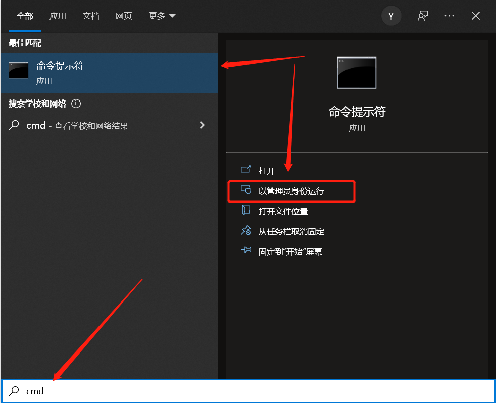 搜索"cmd",在搜索匹配结果"命令提示符",点击下方的"以管理员身份运行",如下图: