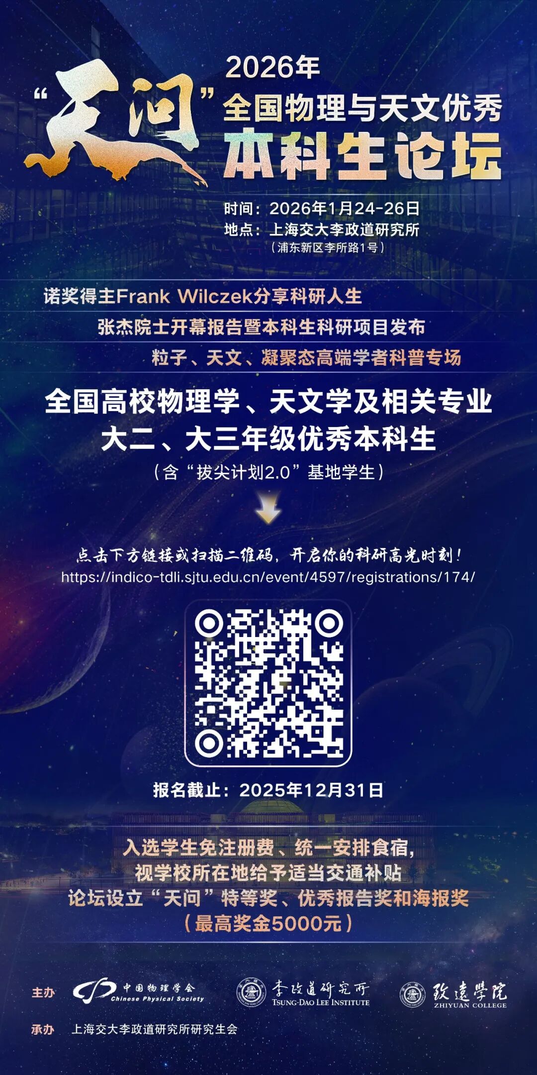 为促进全国高校物理学、天文学及相关交叉学科优秀本科生之间的学术交流,激发创新思维,营造潜心科研、勇于探索的学术氛围,首届“天问”全国物理与天文优秀本科生学术论坛将于2026年1月24-26日在欧宝app官方网站下载李政道研究所举办。本届论坛由中国物理学会、欧宝app官方网站下载李政道研究所和致远学院共同主办,李政道研究所研究生会承办。论坛将通过特邀报告、学生口头报告、海报展示、诺奖得主讲座、学术参访、实验室参观、博士观察团等形式,构建高水平的学术交流平台,助力拔尖创新人才培养。