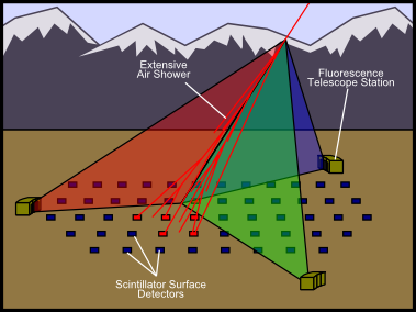 这次看到天照粒子的TA实验就是地面间接探测实验。它位于美国犹他州西部沙漠,海拔1400米,共有507个3平方米的塑料闪烁体探测器,间隔1.2千米排列,组成地面探测阵列,探测面积达到700平方千米。TA实验示意图。图片来源:telescopearray.org本次的天照粒子事例,天文学家探测到了大量的μ子,由此推断天照粒子应该是原子核,而不是高能光子,并用其能量信息重建原初宇宙线的能量。而每个探测器响应的时间先后顺序,可以用来反推出原初宇宙线的运动方向。TA实验还配备有荧光望远镜,用来测量大气中氮气分子受到激发之后发出的荧光(原理类似日常使用的荧光灯)。换句话说,我们可以通过荧光望远镜知道宇宙线粒子究竟由什么元素构成。大气簇射以入射宇宙线为中心,锥形向前扩张,到某一深度后达到最大,这一深度通常记为Xmax。空气中78%是氮气,氮气分子受到大气簇射中的高能光子激发后发出低能量的荧光,通过荧光望远镜观察荧光的范围就可以得出大气簇射发展的程度,测量出Xmax。如果宇宙线是原子核,一般来说越重的核素对应的Xmax会越小,通过简单的线性拟合或者复杂的机器学习方法,宇宙线的核素可以由Xmax反推出来。但是,相比于宇宙线直接探测中人工设计的量能器,大气簇射的计算存在很大的不确定性,所以宇宙线间接探测对核素的分辨并不十分准确。