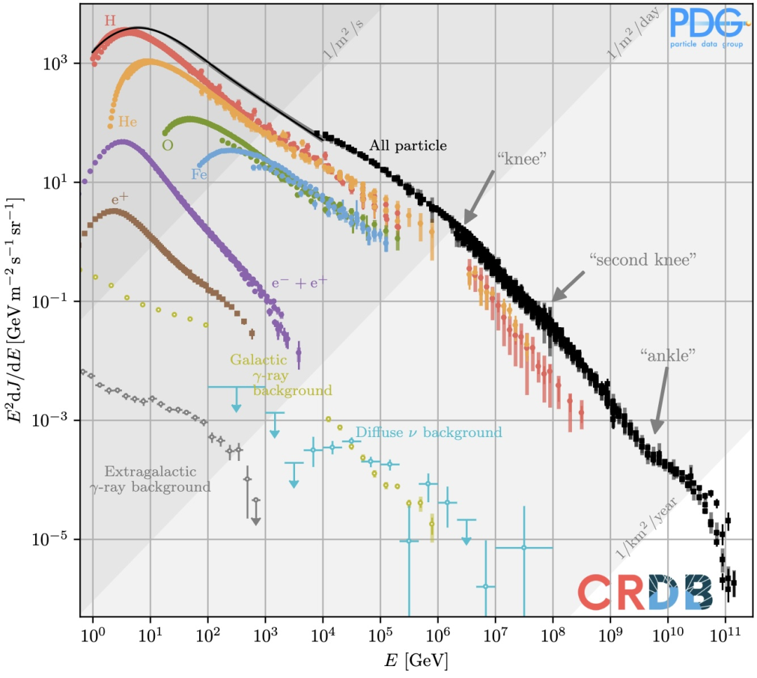 宇宙线的能量跨度非常大,从1MeV(106eV)到OMG粒子级别的300EeV (3×1020eV)。下图展示的是宇宙线流强,或者说能谱(单位时间单位能量单位立体角中通过单位面积的粒子个数):宇宙线能谱。图片来源:Particle Data Group (PDG)。图中黑色点表示的宇宙线总能谱近似满足幂律谱,即在双对数坐标图上是一条直线。在幂律谱基础上的主要结构是高能区域的几个小拐折。天体物理学家把宇宙线能谱形象地比喻成人的腿,左边的拐折是“膝盖”(knee),右边的拐折是“脚踝”(ankle)。在数据丰富之后,膝与踝中间还能出现一个小拐折,被称为“第二个膝盖”(second knee)。这些拐折可能暗示了宇宙线不同的起源机制。右边能谱终止的地方就是天照粒子和OMG粒子的位置,有时也被称为“脚趾”(toe)。总的来说,宇宙线的流强主要集中在几个GeV附近,并随着能量增加快速减少。1GeV能量的宇宙线每平方米每秒就能收集到一万个,而能量高于10EeV的宇宙线粒子,即使在1平方公里面积上,探测到的概率也可以说是百年一遇。不同能量段需要使用不同的探测方法,能量较低部分可以直接探测,高能量部分只能间接探测。宇宙线直接探测就是用粒子探测器直接接收宇宙线粒子。因为大气层的存在,地面上接收到的宇宙线实际上是原初宇宙线与大气层碰撞后产生的次级宇宙线。要直接探测原初宇宙线,只能到大气层外面去。可以使用热气球把探测器送到空气稀薄的高空,或者发射卫星到外太空。例如我国的悟空号暗物质探测卫星(DAMPE),其本质就是一个宇宙线探测器。悟空号使用的探测器类型是量能器,通过测量入射粒子在量能器中的能量沉积,来分辨粒子的种类和能量大小。它通过观测到的宇宙线能谱异常来间接寻找暗物质。1976年诺贝尔物理学奖得主丁肇中领导的阿尔法磁谱仪(AMS-02)实验,是另一个著名的宇宙线直接探测实验。AMS-02于2011年发射,安装在国际空间站上。磁谱仪带有磁铁,利用不同电荷粒子在磁场中偏转角度的不同,对粒子种类的分辨能力比量能器更强。但受到磁铁磁场强度的限制,探测的能量上限通常比量能器要低。人类发射的宇宙线探测器还有许多,比如著名的旅行者1号和2号(Voyager 1,2),尽管它们的主要观测目标是木星、土星,但它们上面都配备了宇宙线系统。目前它们是唯一的一对在太阳系之外直接探测宇宙线的探测器。(编者注:参见《她拍下的这张照片,让人类重新思考宇宙和自身》)不过,卫星上的宇宙线探测器只有1平方米大小,且不说它们可测量的能量上限不够高,就算可以测量天照粒子的能量,偶遇它的几率也只有亿分之一。高能量宇宙线实在太少了,直接探测显然是不现实的。幸运的是,大气层虽然干扰直接探测,但它自己也相当于是一个巨大的量能器,我们可以反推原初宇宙线的性质。单个高能宇宙线粒子与大气层中的物质碰撞后,可能产生μ子、中微子、正反电子、高能伽马光子等等次级粒子,这些次级粒子能量仍然很高,在大气层中运动继续产生新粒子,新粒子再生新粒子,这一过程被称为级联反应(cascade)。最后到达地面的次级粒子数量可以达到数百万个之多。宇宙线在大气中的级联反应也被称为广延大气簇射(Extensive Air Shower),或简称大气簇射。实际上宇宙线直接探测使用的量能器就是利用类似的级联反应原理,只不过是发生在人造探测器中的缩小版。宇宙线间接探测就是利用大气簇射,在地面铺设探测阵列(比如前文提到的LHASSO),探测次级粒子来反推出大气中的能量沉积,进而推测出原初宇宙线的能量、方向,甚至分辨它的粒子类别。在地面的探测器可以间隔几公里放一个,铺开成上千平方公里的探测网,这样大的面积就可以在有限的时间内捕捉到超高能量的宇宙线。