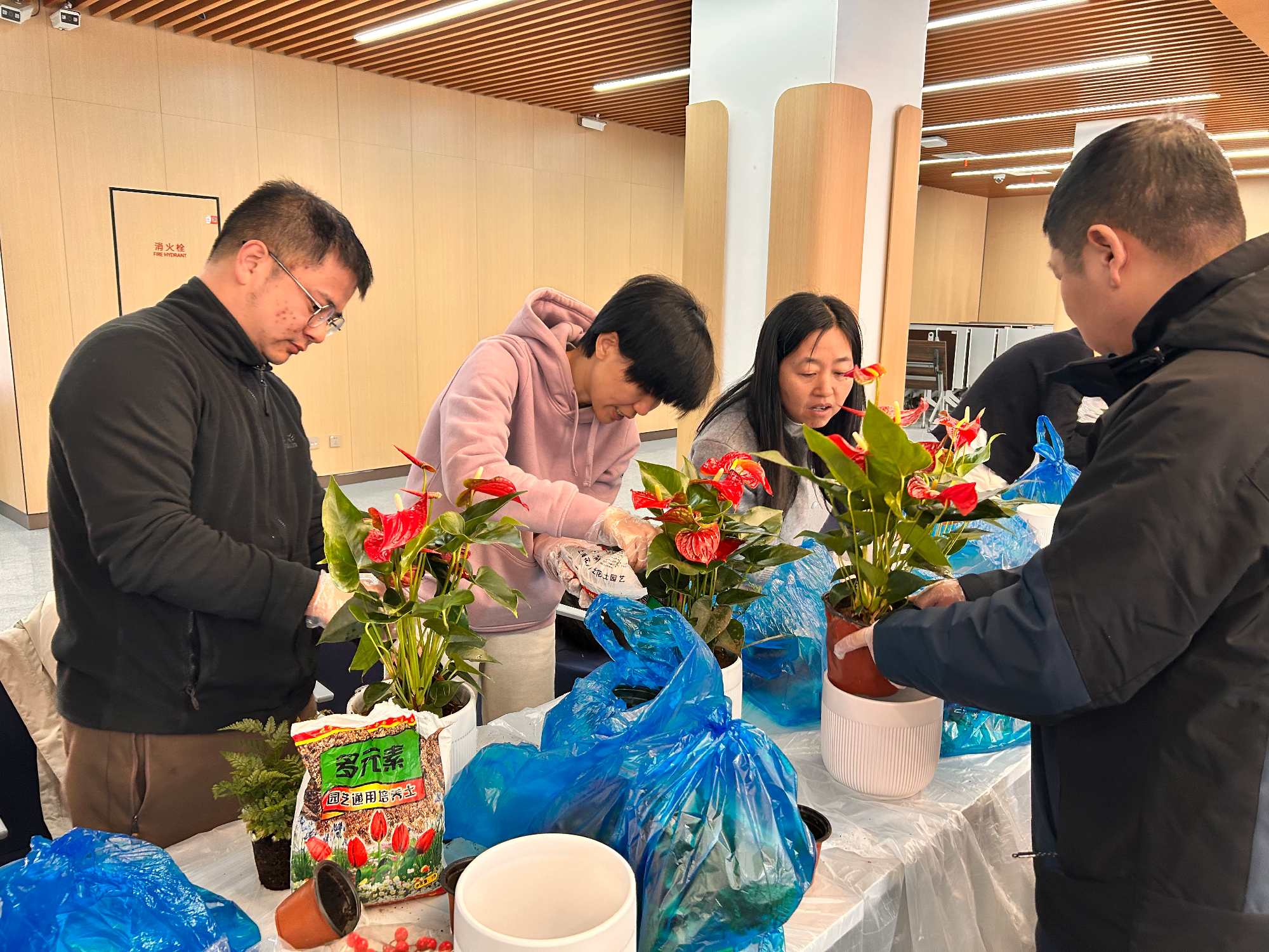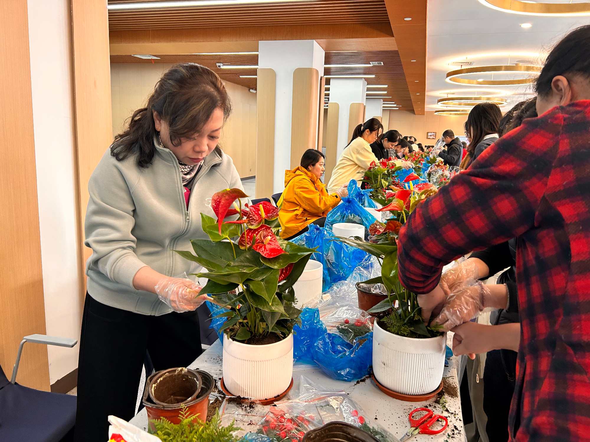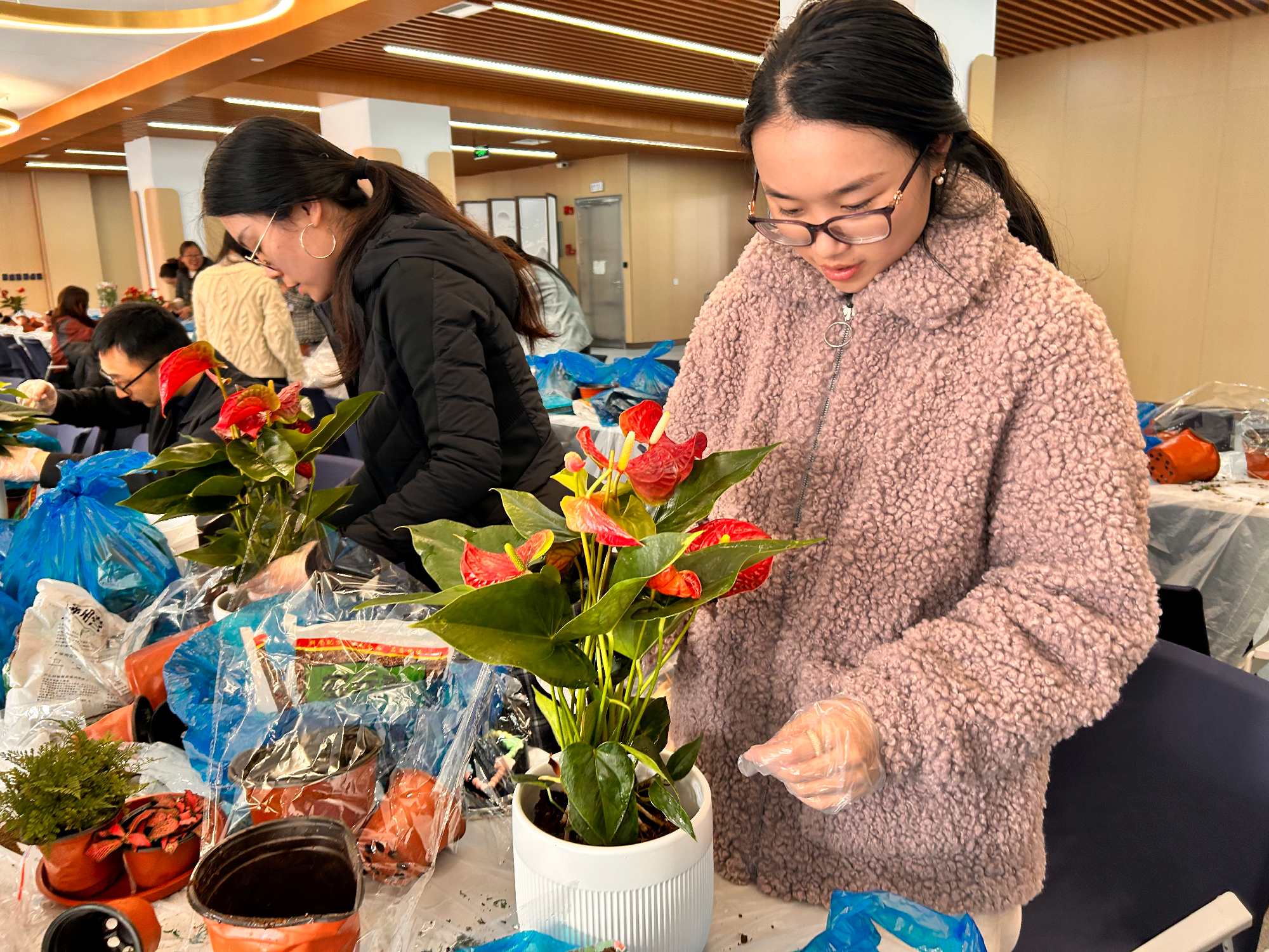 红焰般的红掌搭配翠绿的叶片,经过老师们的巧手装扮,一盆盆各具特色的红掌盆栽新鲜出炉。大家手捧亲手制作的作品,脸上洋溢着满满的成就感,纷纷拍照留念。不少老师表示,在繁忙的教学科研间隙,能参与这样的活动十分难得,既能亲手打造专属绿植,为办公或居家空间增添生机,又能在与同事的轻松交流中舒缓压力。