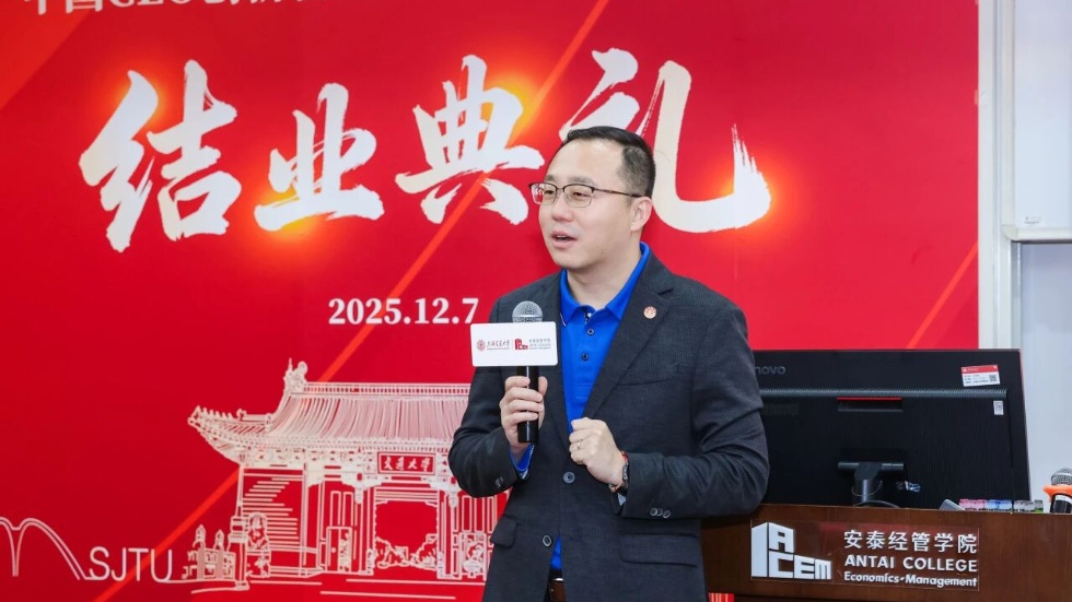 交大安泰经管学院副院长桑大伟勉励同学们:“在这个外部环境与人工智能高速迭代的时代,唯一能抵御焦虑与不确定性的,是自身持续的进化速度。在安泰养成的学习习惯,应成为一份终身礼物。” 同时,他鼓励同学们将课程收获与班级氛围向外辐射,影响更多伙伴;并融入更广阔的“交大系”校友网络(如中国CEO俱乐部、各学院校友),在纵向传承与横向融合中,实现更大范围的“共创”与“共赢”。