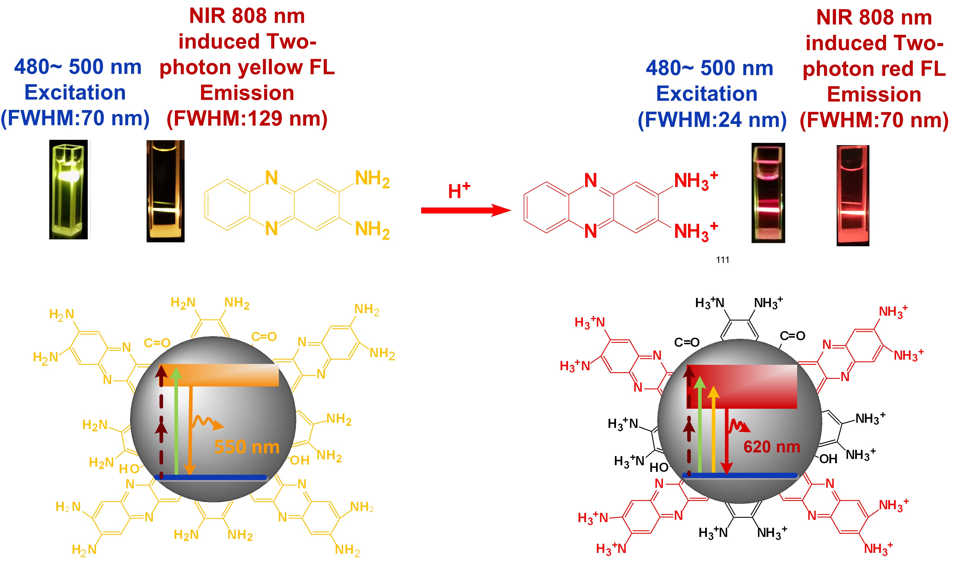 Herein, Carbon Dots simultaneously exhibit high-colour-purity (FWHM~24 nm) long-wavelength one-photon fluorescence emission at 620 nm and NIR induced two-photon fluorescence emission at 630 and 680 nm are prepared by edge amino protonation treatment. Systematic analysis reveals that the protonation of 2,3-diaminophenazine changes the molecular state of Carbon Dots, decreases the photon transition band gap, and triggers red fluorescence emission with the dramatically narrowed peak width. As the oxidation products of reactant o-phenylendiamine, the emergence of 2,3-diaminophenazine as a photoluminescence determiner suggests that fluorophore products of precursor conversion are viable determinants of the desired luminescence properties of Carbon Dots.