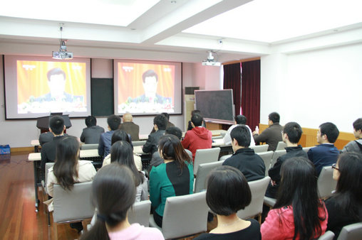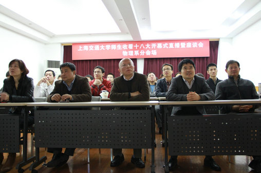 2012年11月8日九点整,中国共产党第十八次全国代表大会在北京隆重召开。上海交大物理系师生在物理系616室同步观看了开幕式,并认真聆听了胡锦涛总书记的工作报告。在场收看开幕式的有物理系党总书记叶庆好、常务副系主任陈险峰、系党委副书记蒋立峰、系党办公主任王晓红、以及各教工支部书记和学生共五十余人。